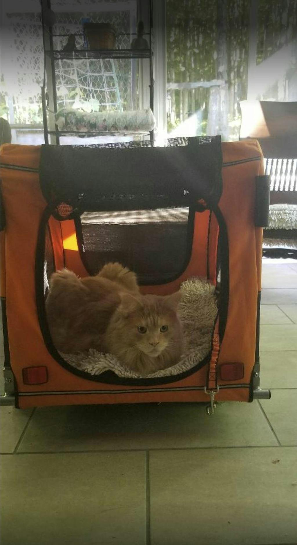 J'ai bien suivi les différentes étapes de désensibilisation: le chariot sans roues dans le salon, le chariot en mode poussette qui bouge puis le chariot accroché au vélo fenêtres fermées puis ouvertes. Cela à pris 1 semaine, jamais maman ne m'a forcé, j'avais un peu peur de ce gros truc mais je me suis habitué avec toutes la gâteries qu'on m'a donné, et maintenant j'ai du fun.