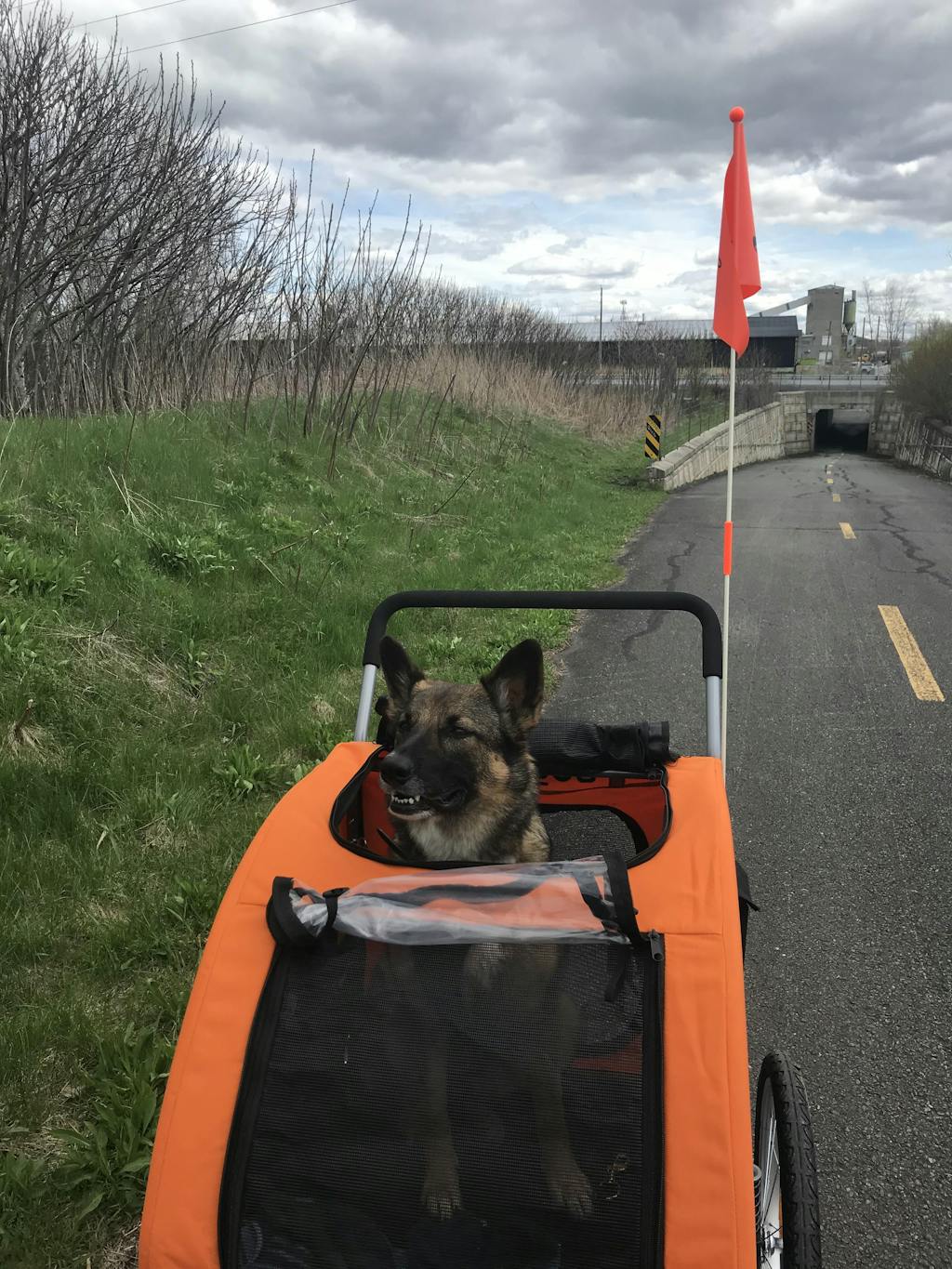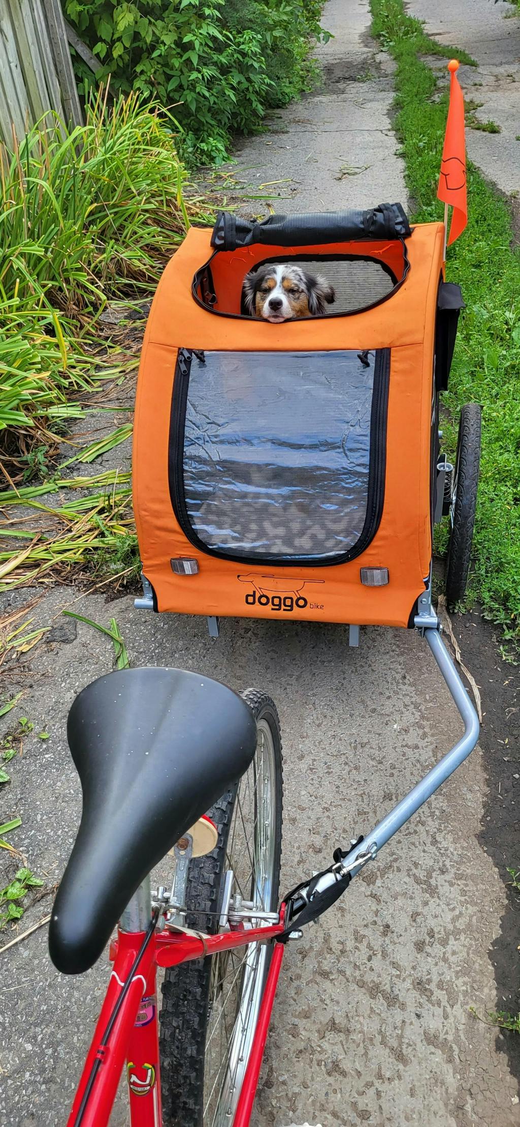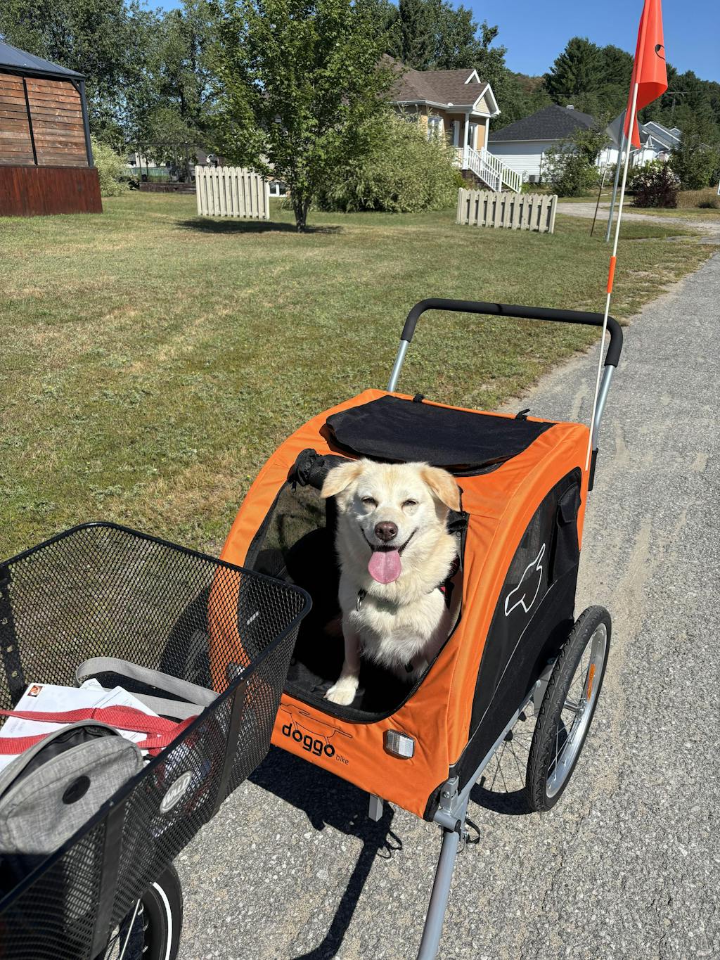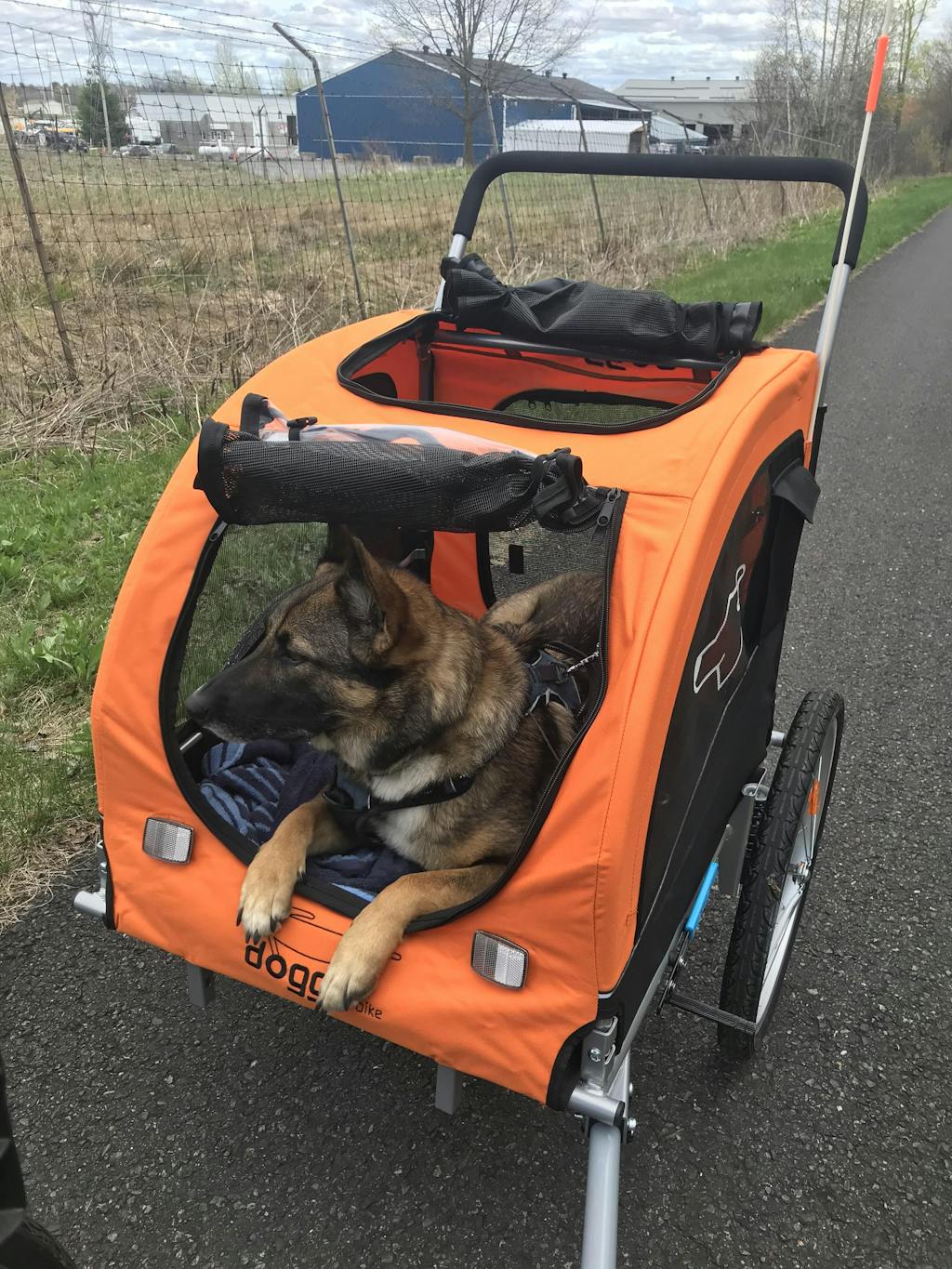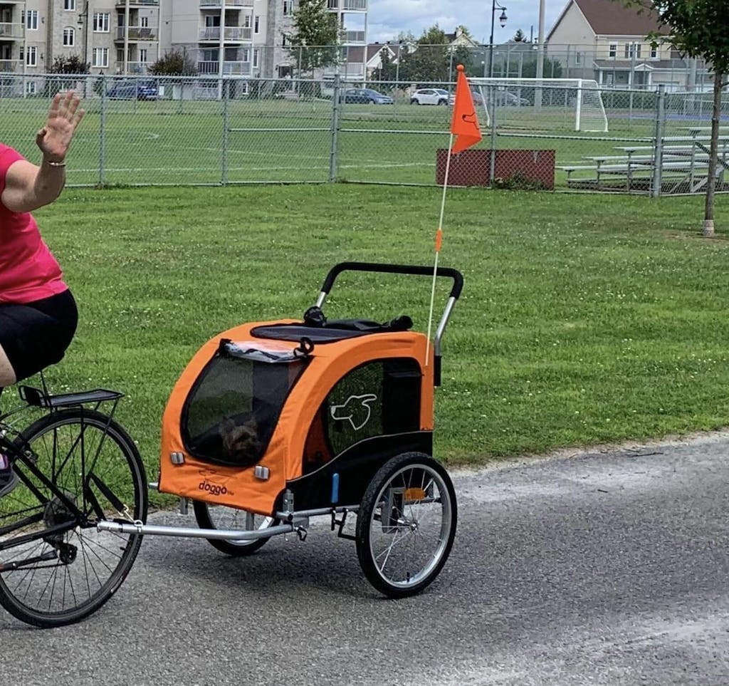 Je me suis procuré le Doggo Bike pour ma belle Agnès. Elle m'accompagne en vélo depuis 3 ans avec une système de laisse attaché à la roue arrière. Cette année elle se fatigue plus vite. Je la mets alors dans la remorque et on peut continuer.