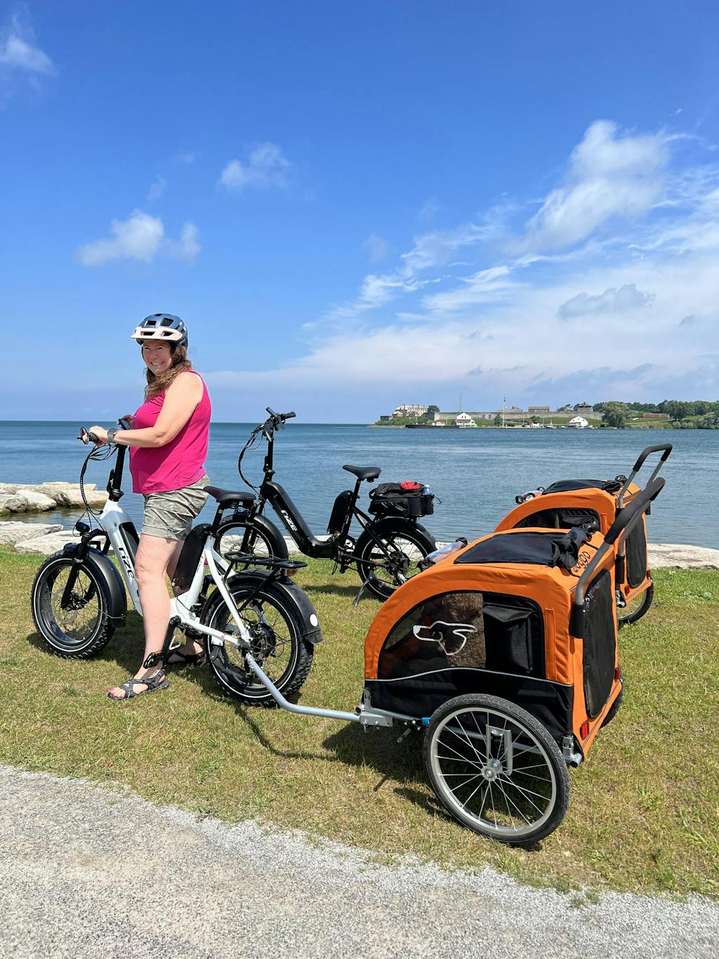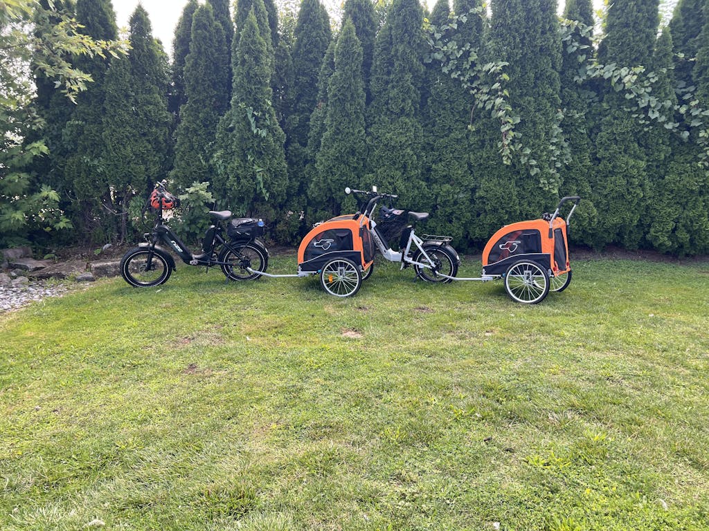 We were going on a new adventure for us with E-bikes and didn’t want to leave our furry friends behind on our day long excursions while at Niagara on the lake area. We found these trailers to be large enough to house our larger dogs. We purchased two trailers, his (Charlie 60lbs) and hers (Willow 80 lbs). Very easy to fold flat and pop up and secure into position. The trailers had a lot of attention from others and asking questions. Very well made and was surprised at the shock system it had to add to the comfort level for our pets. The trailer has many zippered in flaps if you like to keep your pet secure while they are adapting to their new ride. Fastened adjustable leash included provided us the extra comfort of having them in there while we opened the top flap and they had their head stuck out taking in the views and breeze in their hair! Highly recommend these trailers to anyone wanting to bring their fur babies out on a bike tour.