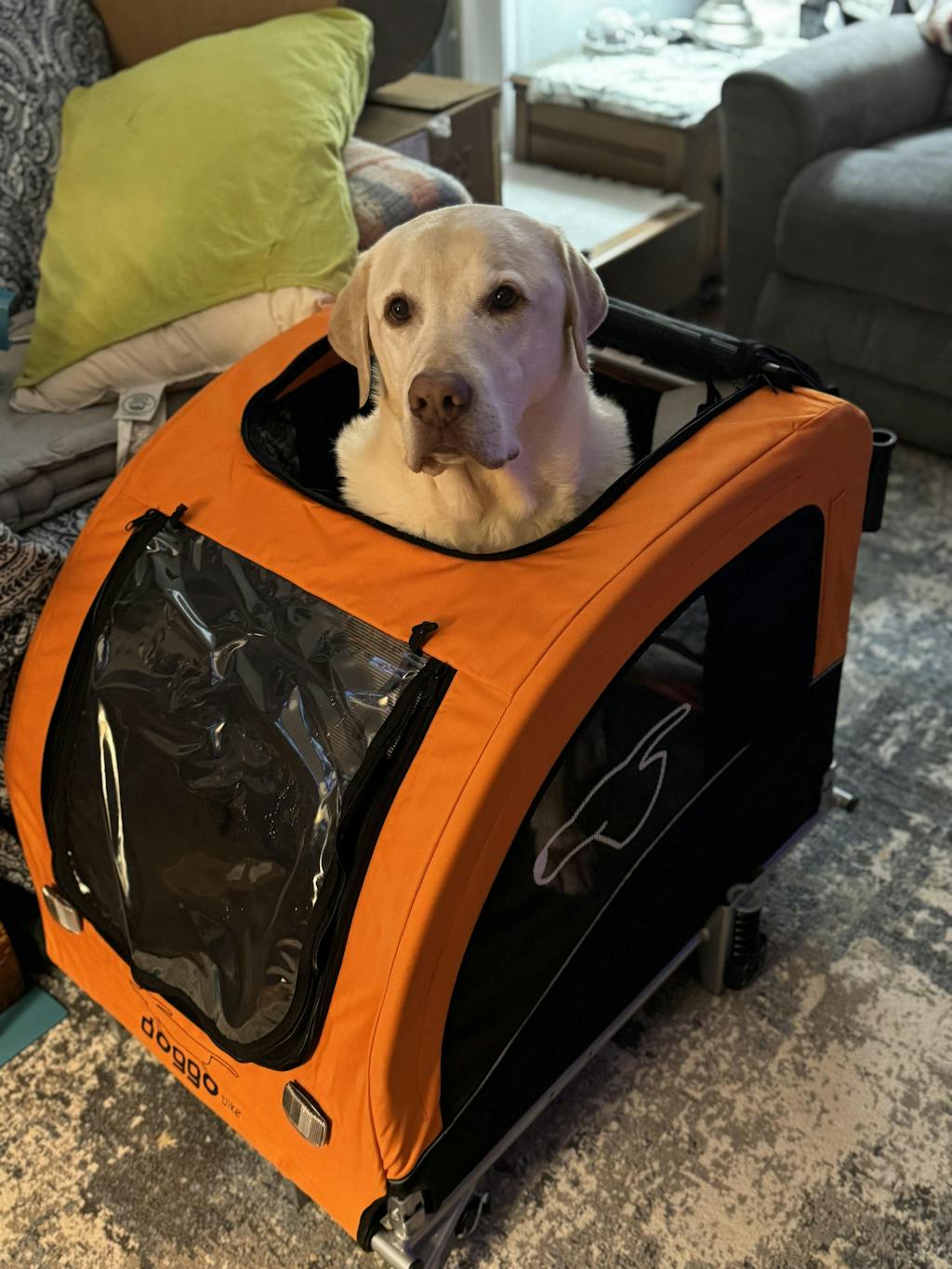 My Doggo trailer has been great. I bought it last spring (2022) and used it extensively over the summer. It is well made with durable fabrics, a strong aluminum frame, and is very easy to set up and also fold down to put in a car or basement. My 65 pound Gertie fits perfectly and comfortably inside the trailer; she was nervous about it at first but I followed their excellent video on how to gradually acclimate your dog to the trailer. I added a thicker dog bed to the interior to help and it has worked out well.