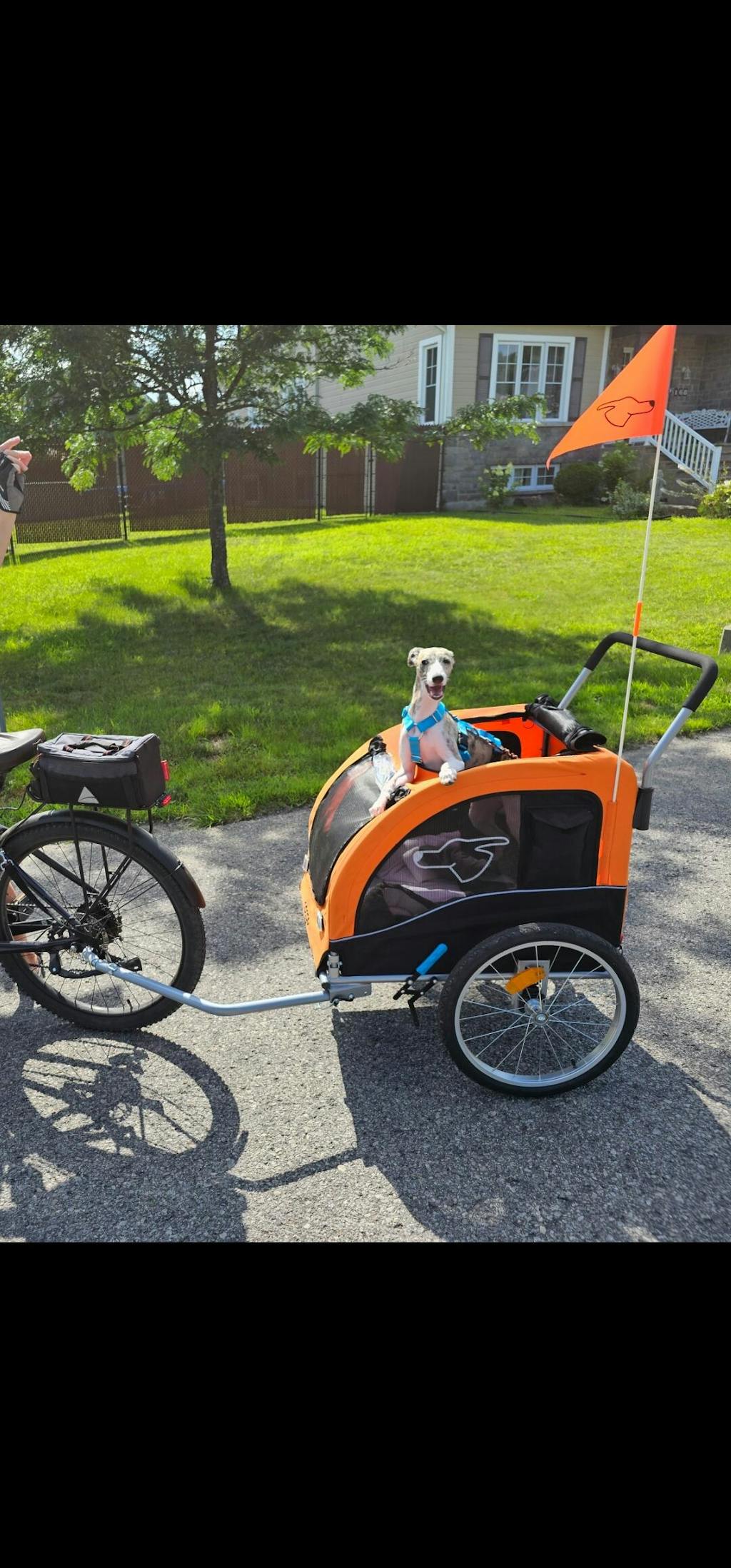 Nous adorons le chariot, facile à monter et à installer. Les chiens adorent les balades. C très sécuritaire et bien conçu.